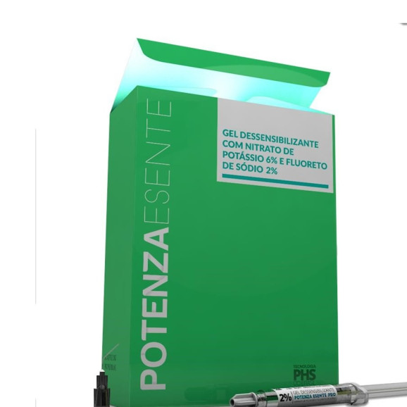* POTENZA ESENTE 2% é um gel dessensibilizante tópico de baixa viscosidade de pH neutro com dupla ação dessensibilizante à base de Nitrato de Potássio 6% (ação neural) e Fluoreto de Sódio a 2% (ação oclusão) que não interfere na velocidade do clareamento dental.