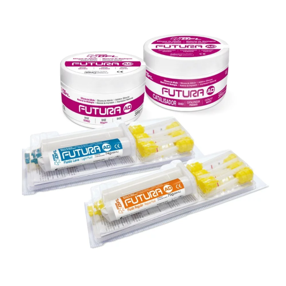 Kit com 2 potes de Futura AD Pasta Densa (250ml Base+250ml Catalisador);Cartucho de automistura de Futura AD Pasta Fluida Regular com 50mL;Cartucho de automistura de Futura AD Pasta Fluida Leve com 50mL;12 pontas misturadoras;12 pontas intraorais.